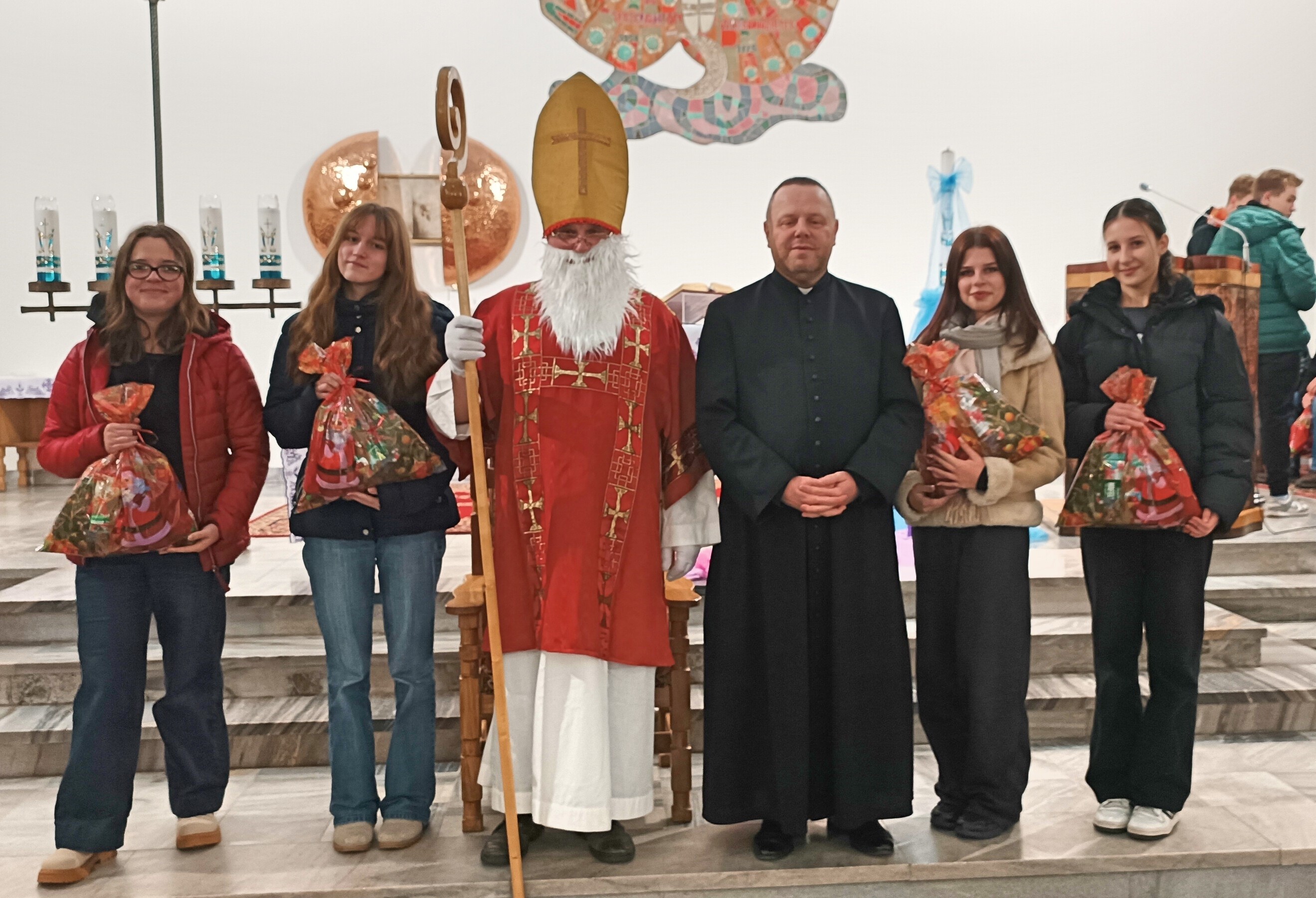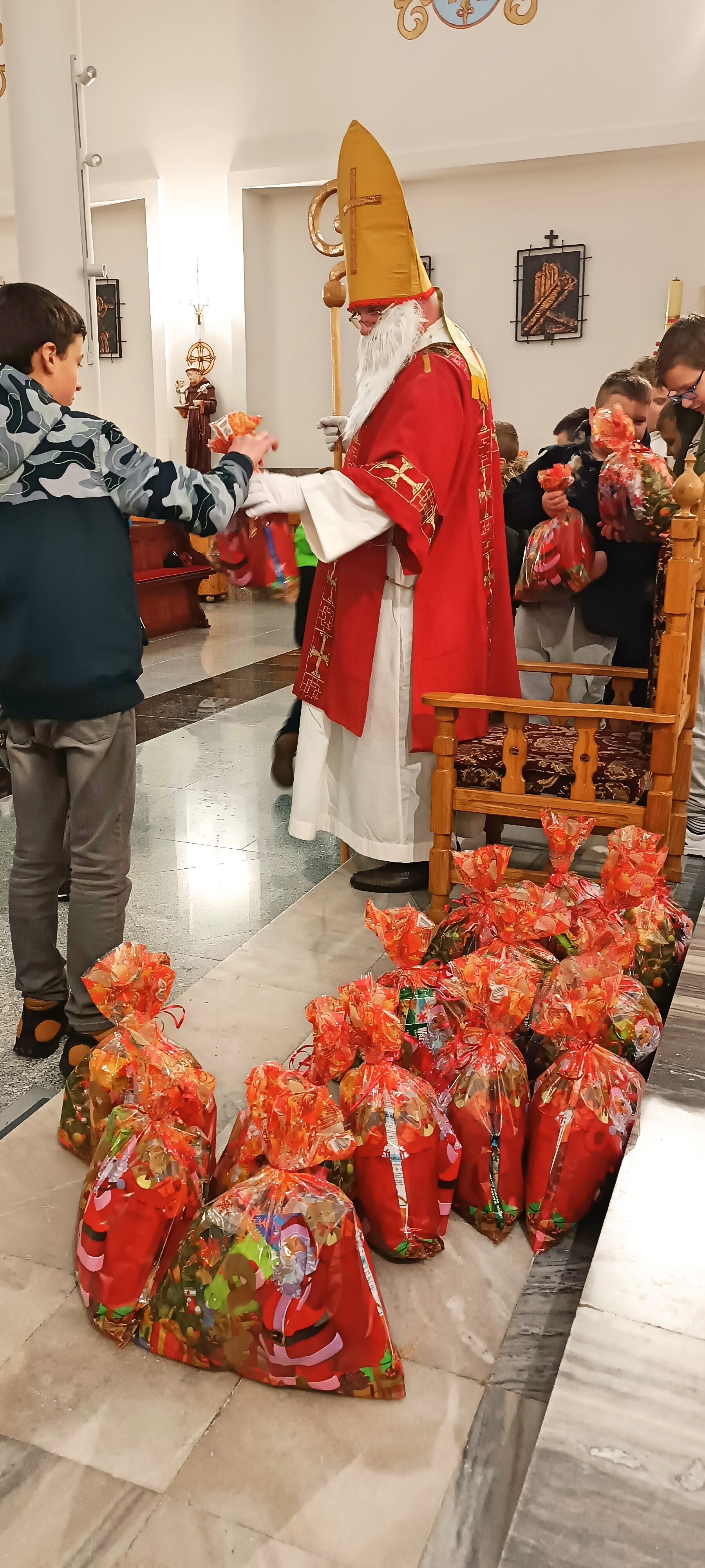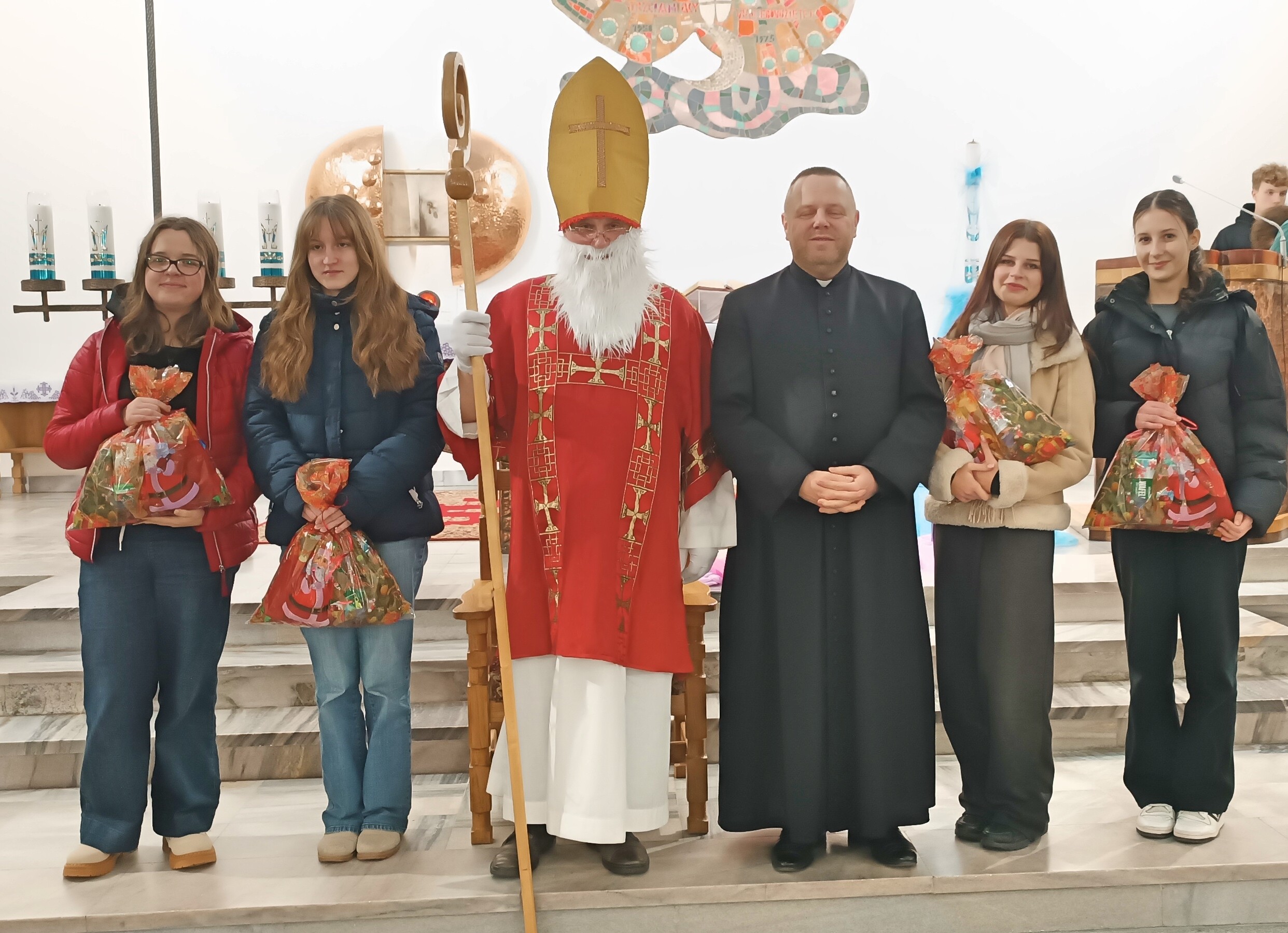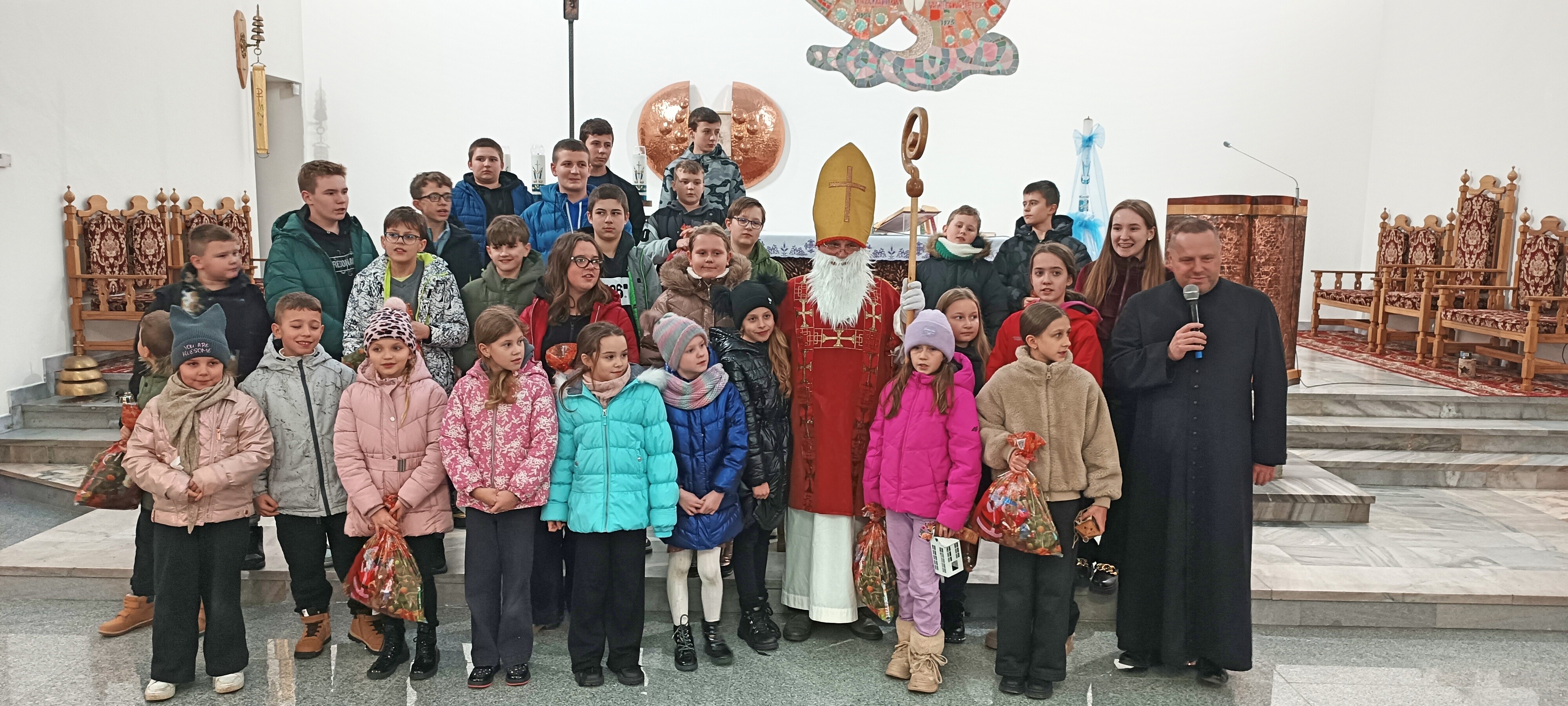 Mikołaj, przywitał wszystkich z wielką serdecznością i ciepłem. Następnie przystąpił do rozdawania upominków, które przygotowano specjalnie dla młodych zaangażowanych w życie naszej parafii. Dziewczęca Służba Maryjna, Liturgiczna Służba Ołtarza oraz Młodzieżowa Grupa Parafialna otrzymały drobne prezenty jako wyraz wdzięczności za ich gorliwą służbę, obecność i zaangażowanie.