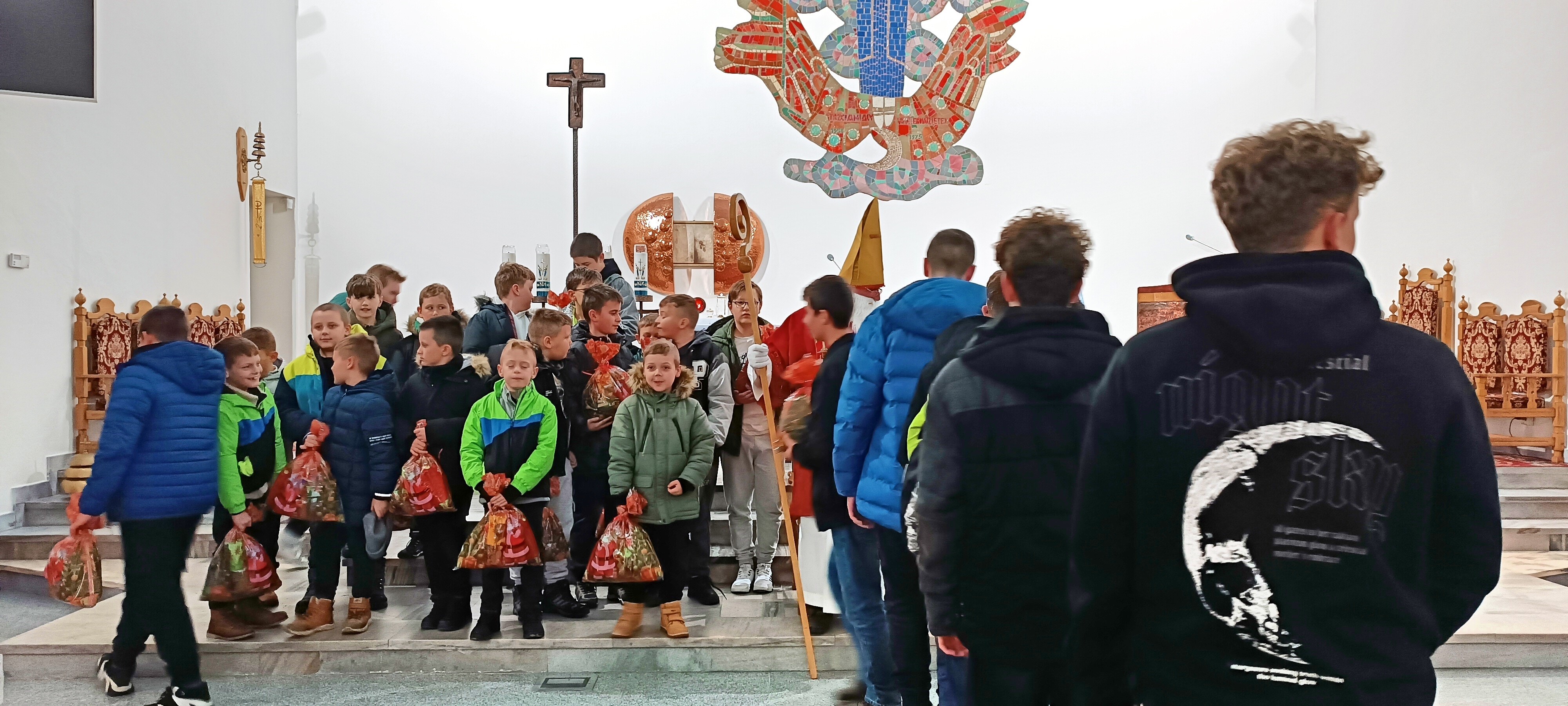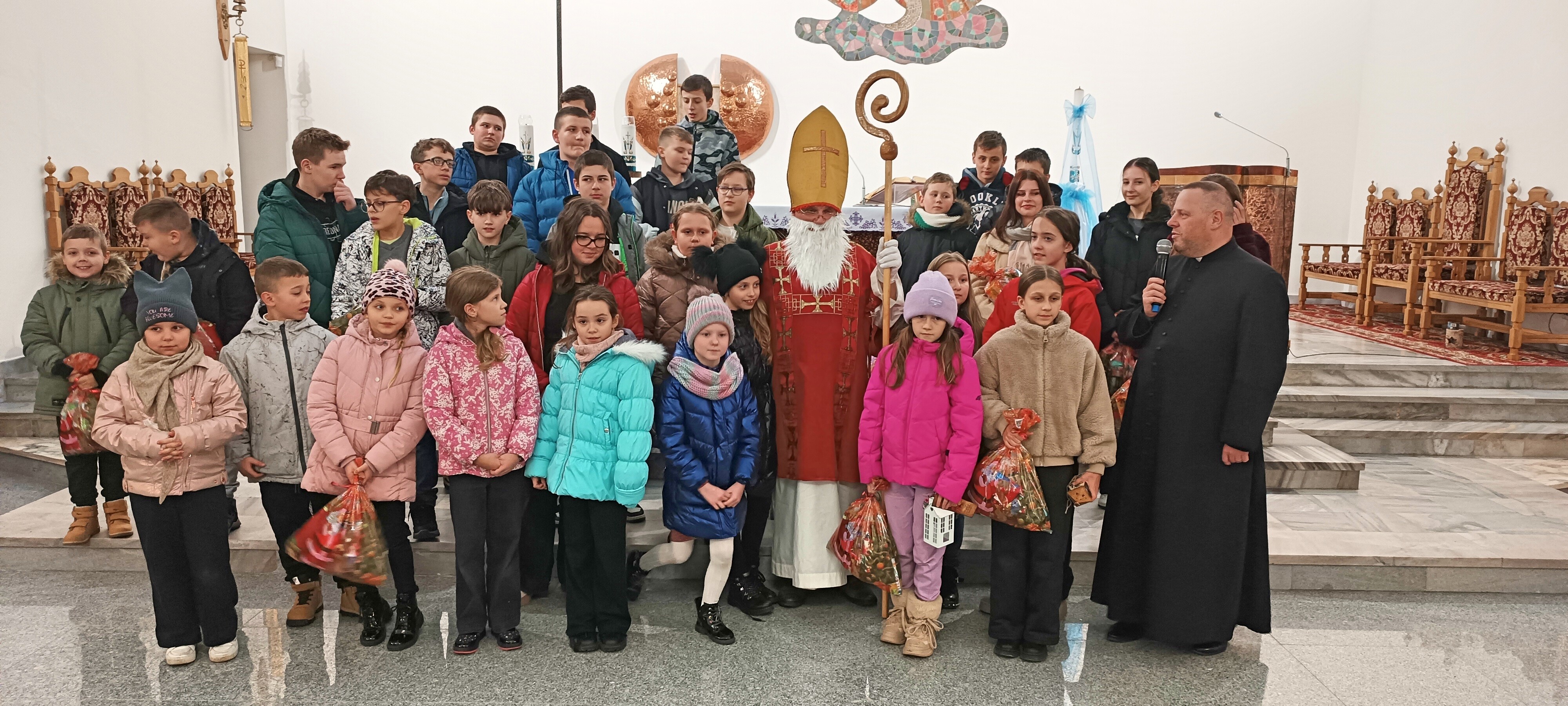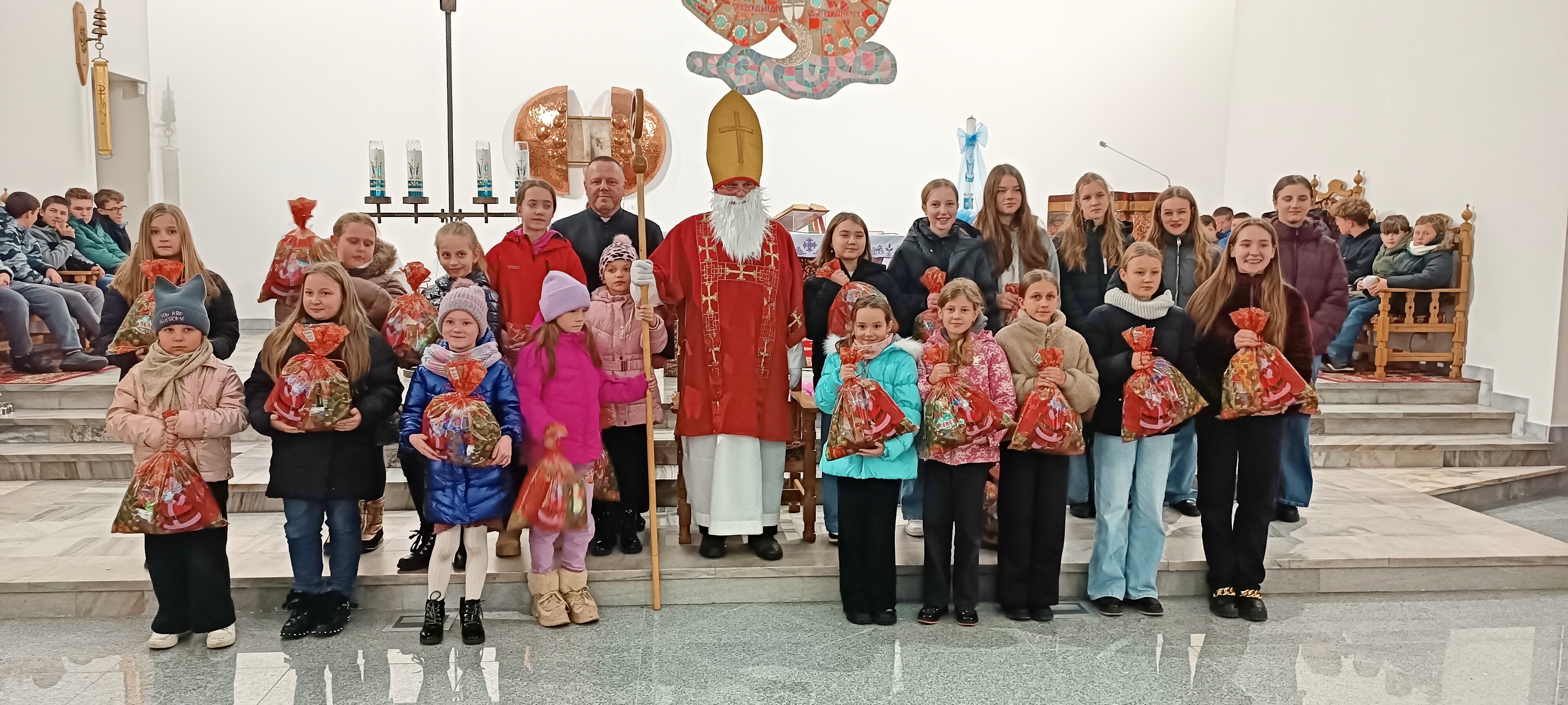 Mikołaj, przywitał wszystkich z wielką serdecznością i ciepłem. Następnie przystąpił do rozdawania upominków, które przygotowano specjalnie dla młodych zaangażowanych w życie naszej parafii. Dziewczęca Służba Maryjna, Liturgiczna Służba Ołtarza oraz Młodzieżowa Grupa Parafialna otrzymały drobne prezenty jako wyraz wdzięczności za ich gorliwą służbę, obecność i zaangażowanie.