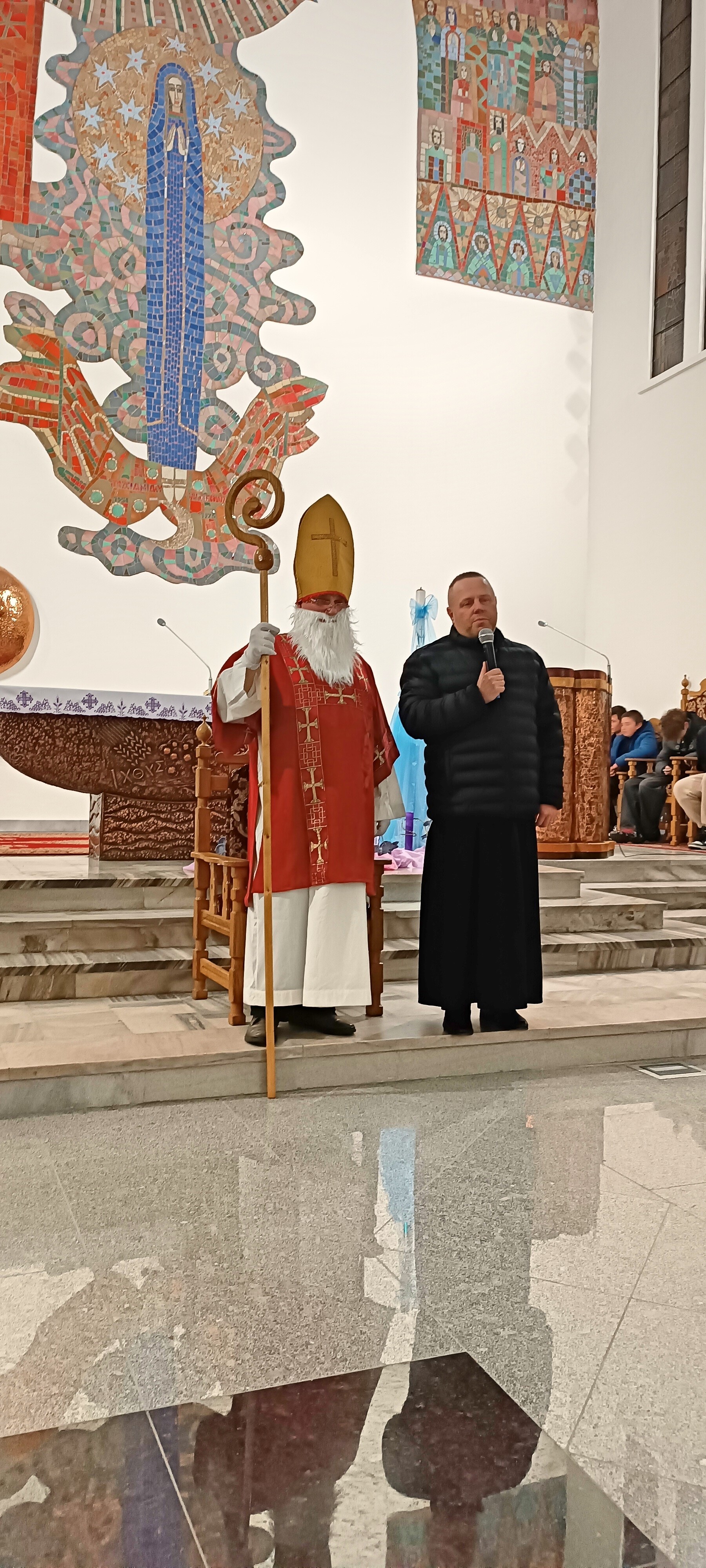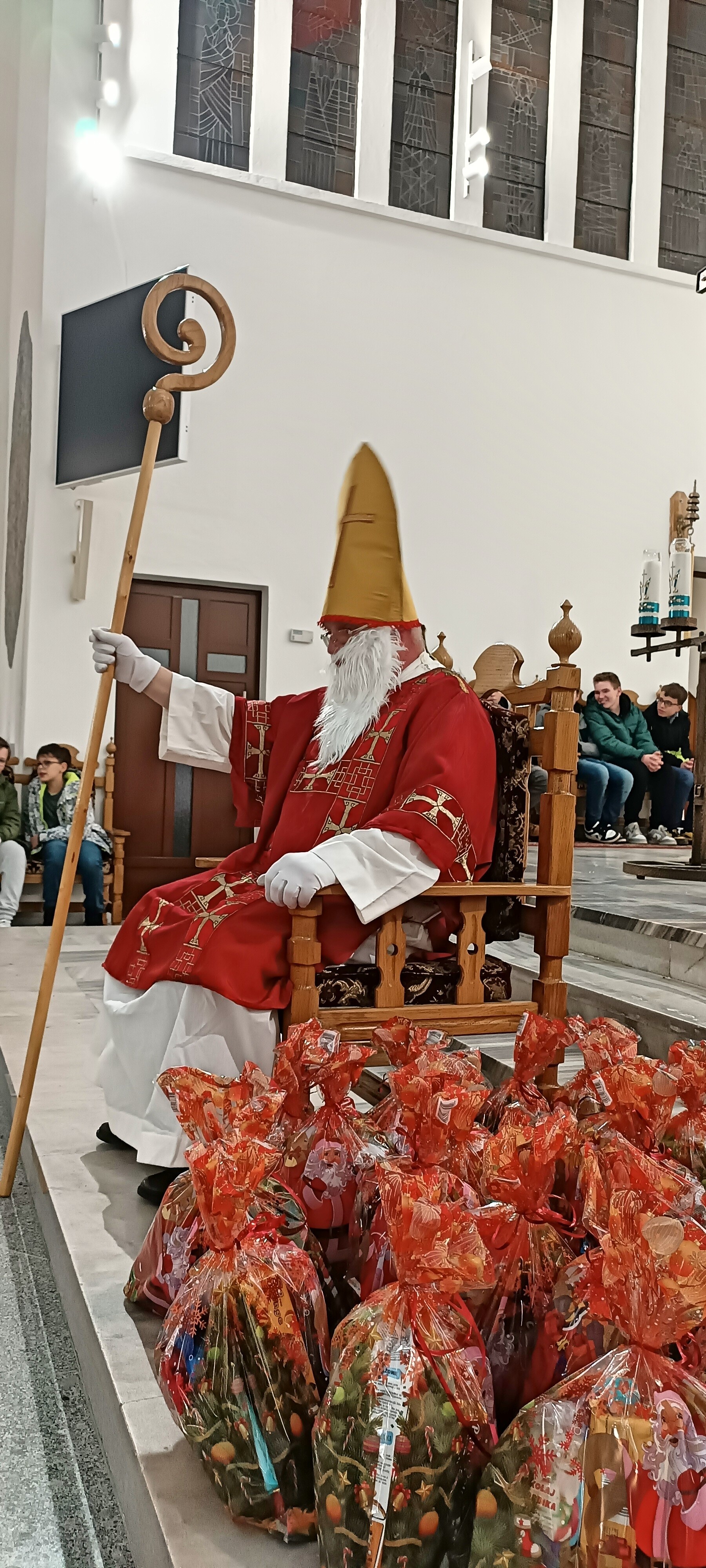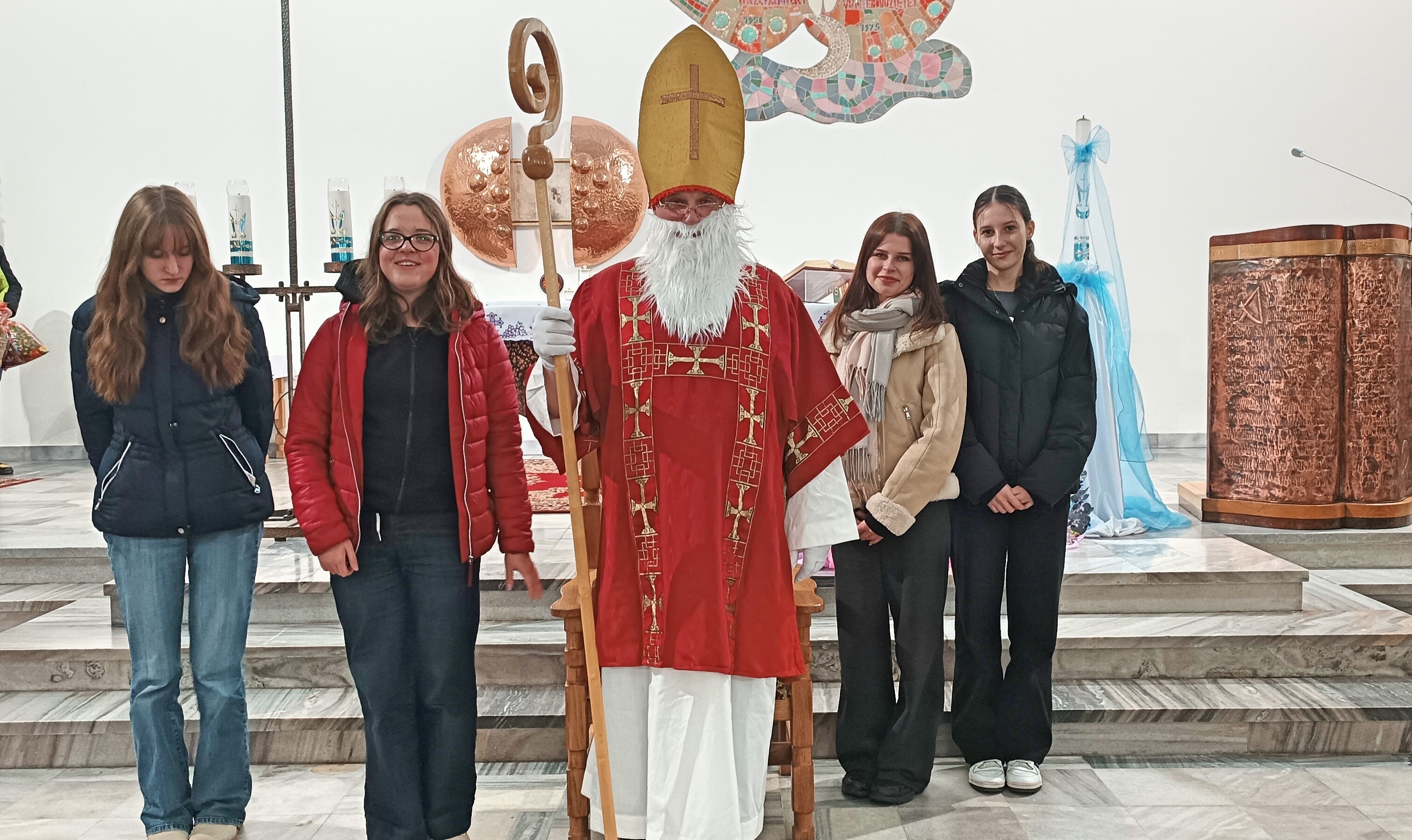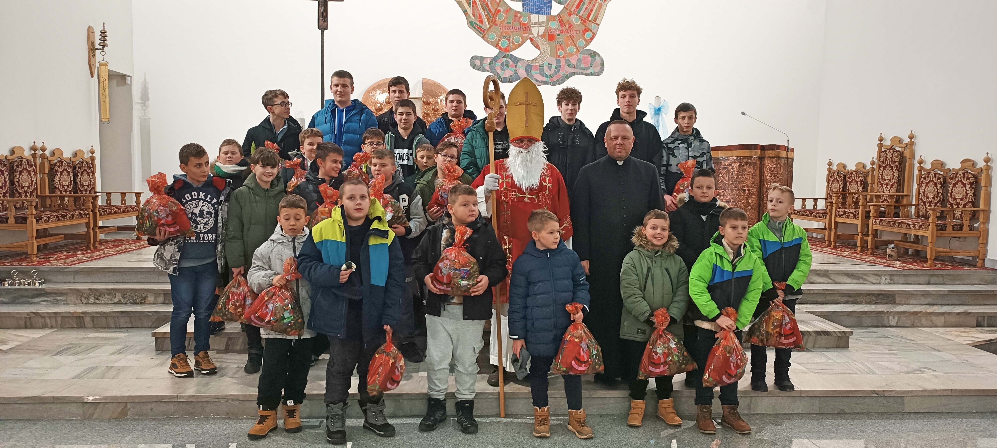 Mikołaj, przywitał wszystkich z wielką serdecznością i ciepłem. Następnie przystąpił do rozdawania upominków, które przygotowano specjalnie dla młodych zaangażowanych w życie naszej parafii. Dziewczęca Służba Maryjna, Liturgiczna Służba Ołtarza oraz Młodzieżowa Grupa Parafialna otrzymały drobne prezenty jako wyraz wdzięczności za ich gorliwą służbę, obecność i zaangażowanie.